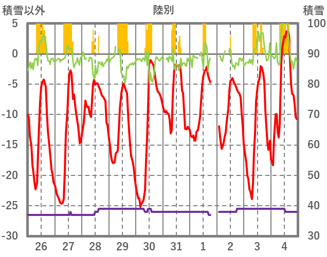 | 日 | 時 | 気温 | 降水 | 風向/風速 | 日照 | 積雪 | 降雪 |