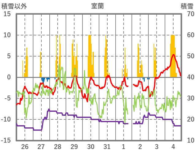 | 日 | 時 | 気温 | 降水 | 風向/風速 | 日照 | 積雪 | 降雪 |
