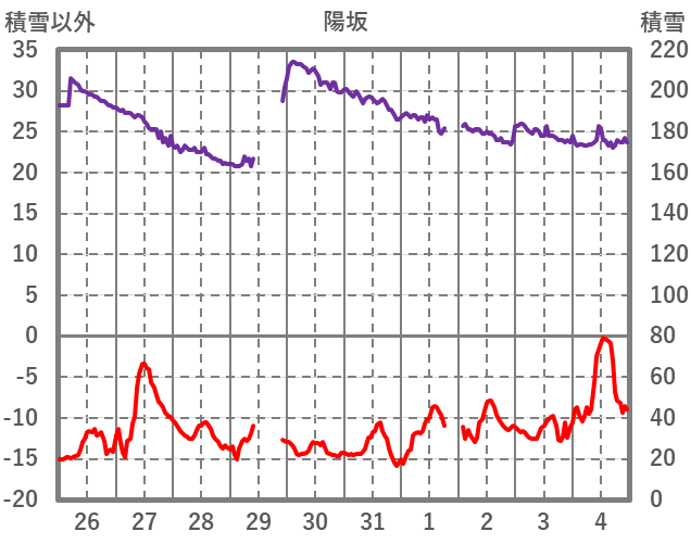 | 日 | 時 | 気温 | 降水 | 風向/風速 | 日照 | 積雪 | 降雪 |
