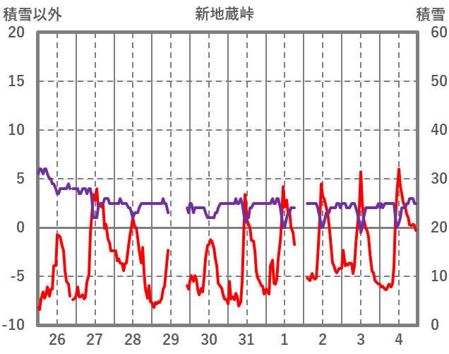 | 日 | 時 | 気温 | 降水 | 風向/風速 | 日照 | 積雪 | 降雪 |