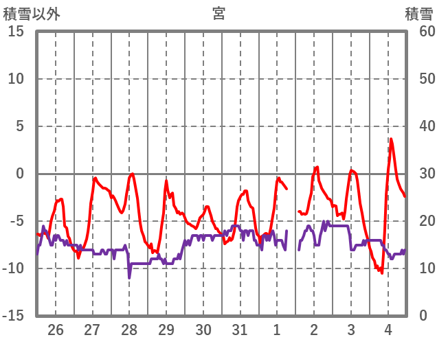 | 日 | 時 | 気温 | 降水 | 風向/風速 | 日照 | 積雪 | 降雪 |