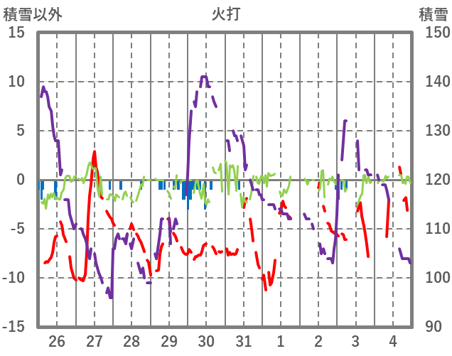 | 日 | 時 | 気温 | 降水 | 風向/風速 | 日照 | 積雪 | 降雪 |