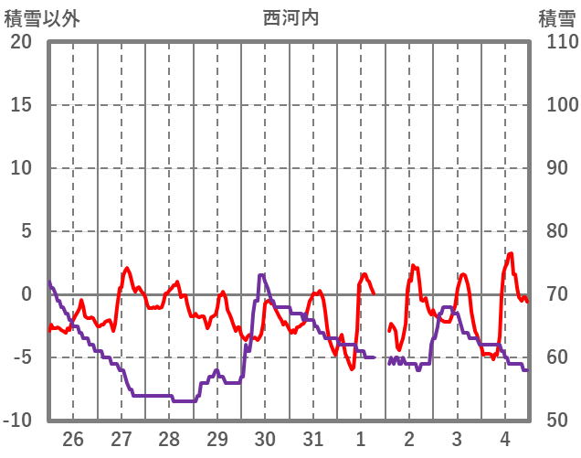 | 日 | 時 | 気温 | 降水 | 風向/風速 | 日照 | 積雪 | 降雪 |