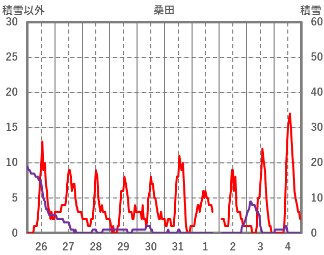 | 日 | 時 | 気温 | 降水 | 風向/風速 | 日照 | 積雪 | 降雪 |