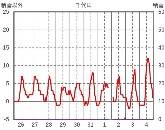| 日 | 時 | 気温 | 降水 | 風向/風速 | 日照 | 積雪 | 降雪 |