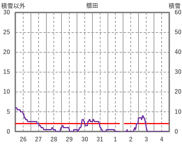 | 日 | 時 | 気温 | 降水 | 風向/風速 | 日照 | 積雪 | 降雪 |
