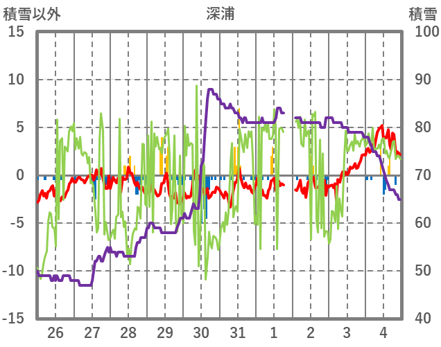 | 日 | 時 | 気温 | 降水 | 風向/風速 | 日照 | 積雪 | 降雪 |