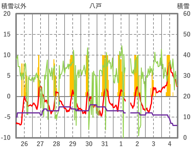 | 日 | 時 | 気温 | 降水 | 風向/風速 | 日照 | 積雪 | 降雪 |