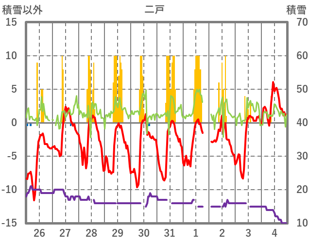 | 日 | 時 | 気温 | 降水 | 風向/風速 | 日照 | 積雪 | 降雪 |