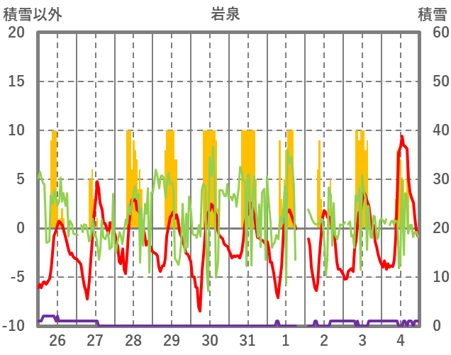 | 日 | 時 | 気温 | 降水 | 風向/風速 | 日照 | 積雪 | 降雪 |