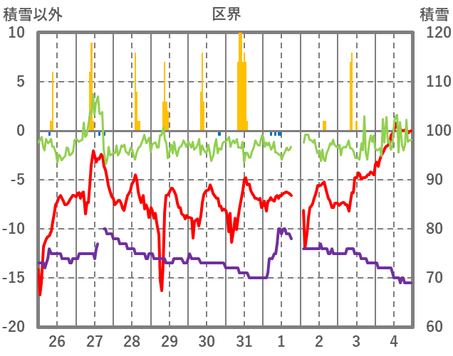 | 日 | 時 | 気温 | 降水 | 風向/風速 | 日照 | 積雪 | 降雪 |