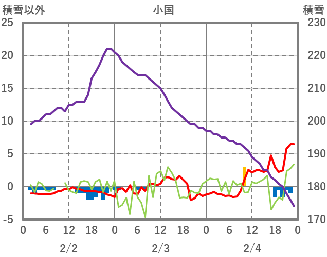 | 日 | 時 | 気温 | 降水 | 風向/風速 | 日照 | 積雪 | 降雪 |