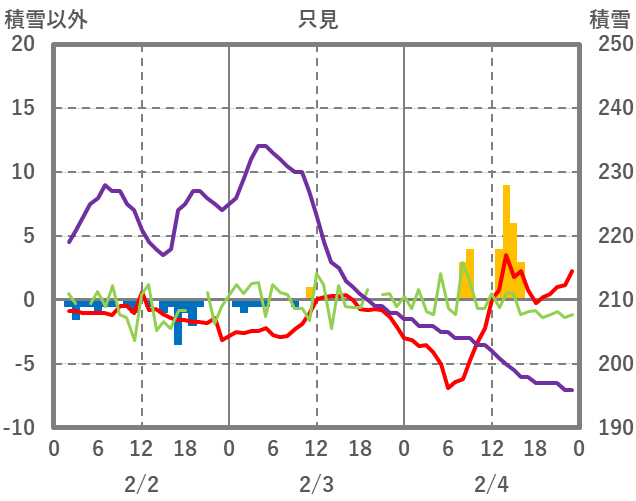 | 日 | 時 | 気温 | 降水 | 風向/風速 | 日照 | 積雪 | 降雪 |