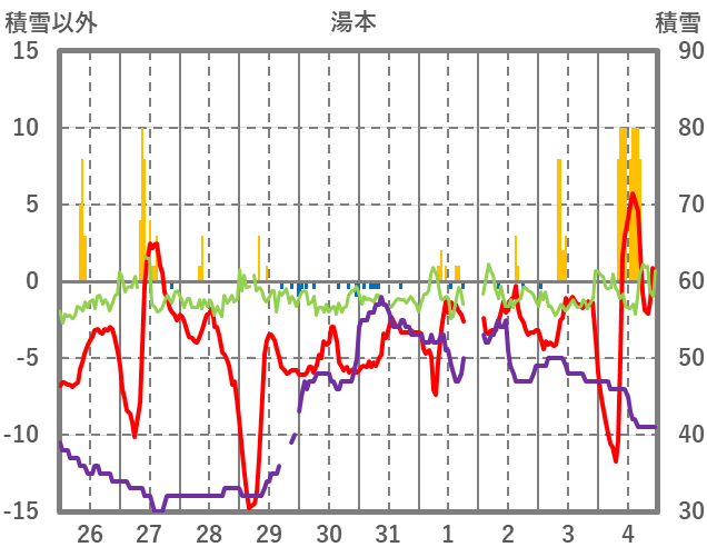 | 日 | 時 | 気温 | 降水 | 風向/風速 | 日照 | 積雪 | 降雪 |