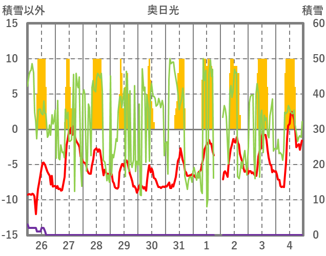| 日 | 時 | 気温 | 降水 | 風向/風速 | 日照 | 積雪 | 降雪 |
