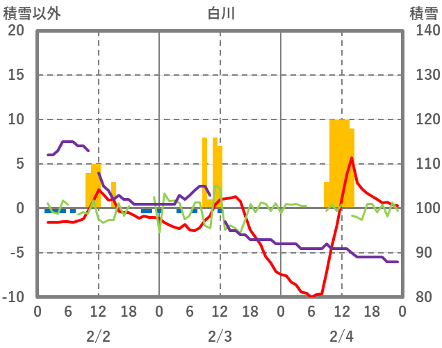 | 日 | 時 | 気温 | 降水 | 風向/風速 | 日照 | 積雪 | 降雪 |