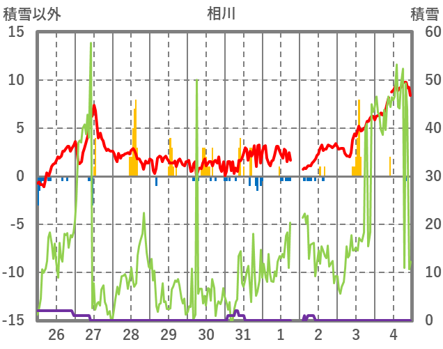 | 日 | 時 | 気温 | 降水 | 風向/風速 | 日照 | 積雪 | 降雪 |