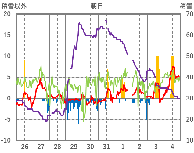 | 日 | 時 | 気温 | 降水 | 風向/風速 | 日照 | 積雪 | 降雪 |