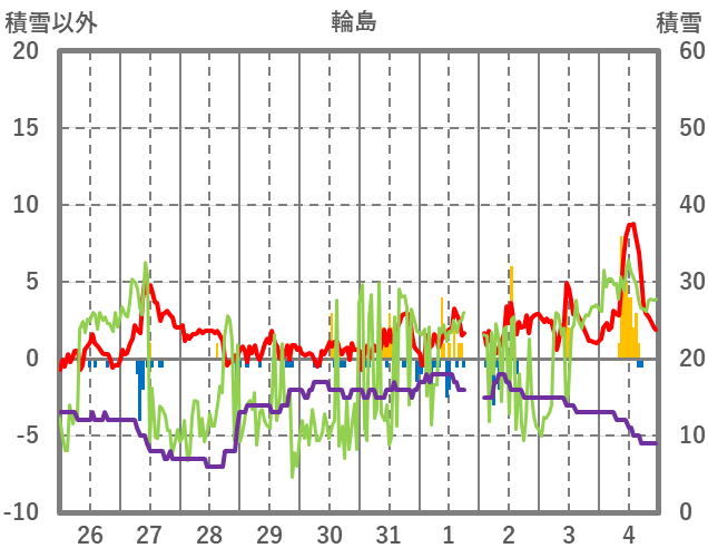 | 日 | 時 | 気温 | 降水 | 風向/風速 | 日照 | 積雪 | 降雪 |