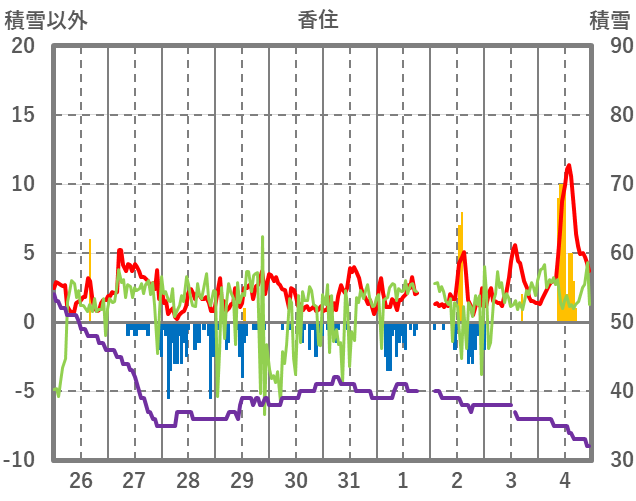 | 日 | 時 | 気温 | 降水 | 風向/風速 | 日照 | 積雪 | 降雪 |