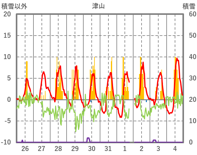 | 日 | 時 | 気温 | 降水 | 風向/風速 | 日照 | 積雪 | 降雪 |