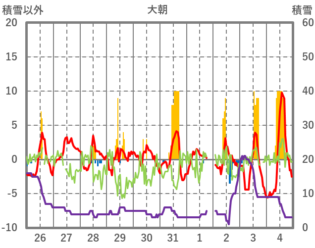 | 日 | 時 | 気温 | 降水 | 風向/風速 | 日照 | 積雪 | 降雪 |
