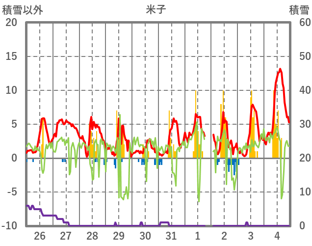 | 日 | 時 | 気温 | 降水 | 風向/風速 | 日照 | 積雪 | 降雪 |