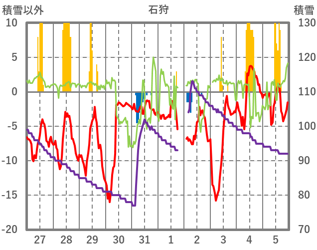 | 日 | 時 | 気温 | 降水 | 風向/風速 | 日照 | 積雪 | 降雪 |