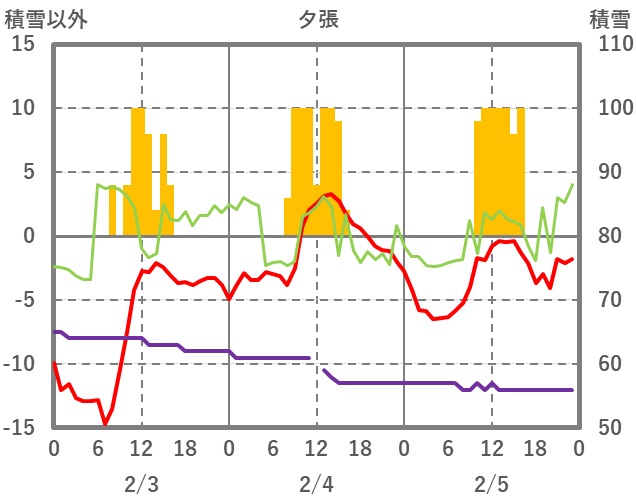 | 日 | 時 | 気温 | 降水 | 風向/風速 | 日照 | 積雪 | 降雪 |