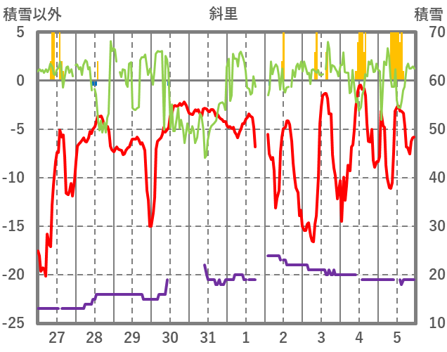 | 日 | 時 | 気温 | 降水 | 風向/風速 | 日照 | 積雪 | 降雪 |