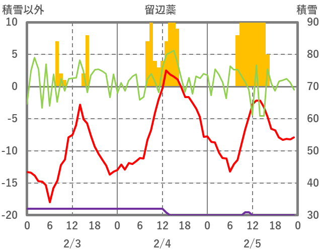 | 日 | 時 | 気温 | 降水 | 風向/風速 | 日照 | 積雪 | 降雪 |