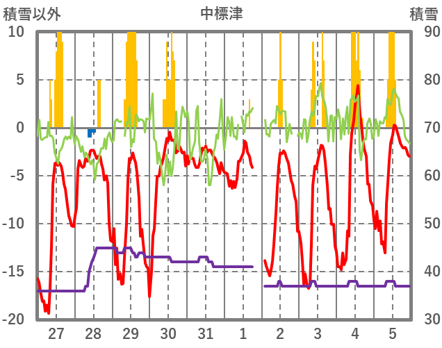 | 日 | 時 | 気温 | 降水 | 風向/風速 | 日照 | 積雪 | 降雪 |