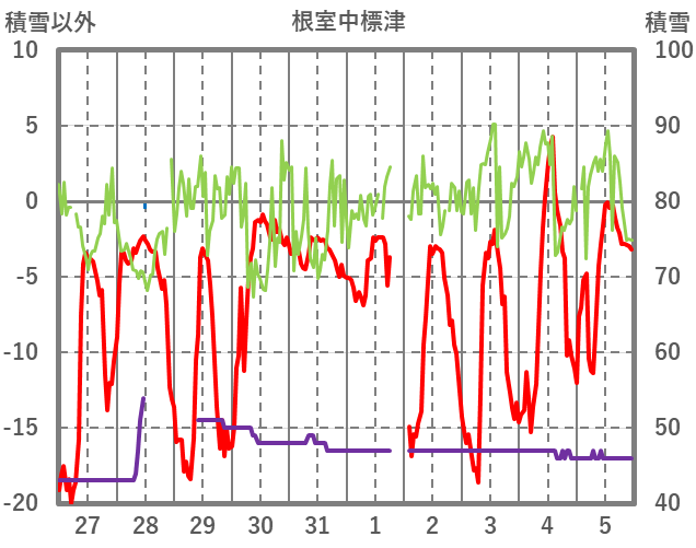 | 日 | 時 | 気温 | 降水 | 風向/風速 | 日照 | 積雪 | 降雪 |