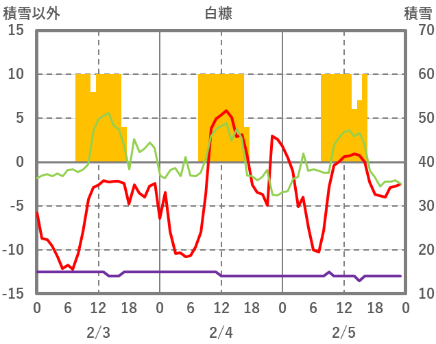 | 日 | 時 | 気温 | 降水 | 風向/風速 | 日照 | 積雪 | 降雪 |