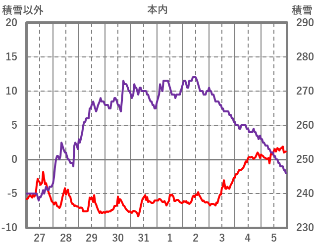 | 日 | 時 | 気温 | 降水 | 風向/風速 | 日照 | 積雪 | 降雪 |