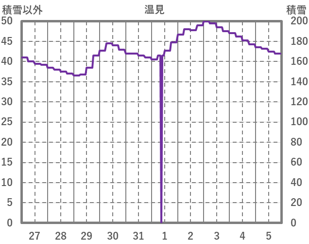 | 日 | 時 | 気温 | 降水 | 風向/風速 | 日照 | 積雪 | 降雪 |