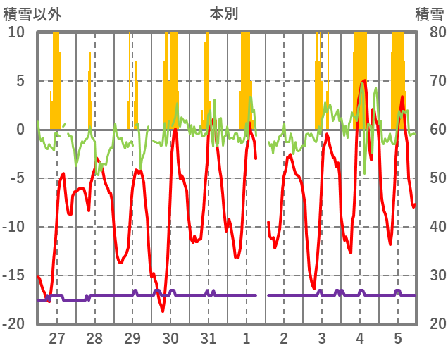 | 日 | 時 | 気温 | 降水 | 風向/風速 | 日照 | 積雪 | 降雪 |