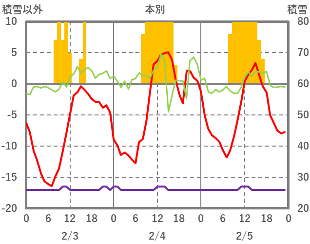 | 日 | 時 | 気温 | 降水 | 風向/風速 | 日照 | 積雪 | 降雪 |