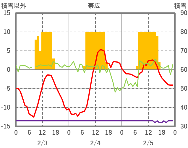 | 日 | 時 | 気温 | 降水 | 風向/風速 | 日照 | 積雪 | 降雪 |