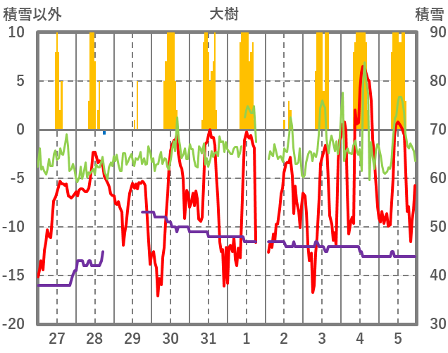 | 日 | 時 | 気温 | 降水 | 風向/風速 | 日照 | 積雪 | 降雪 |