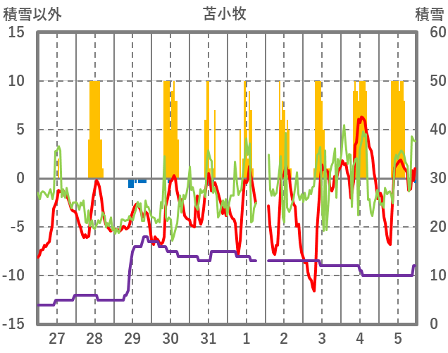 | 日 | 時 | 気温 | 降水 | 風向/風速 | 日照 | 積雪 | 降雪 |