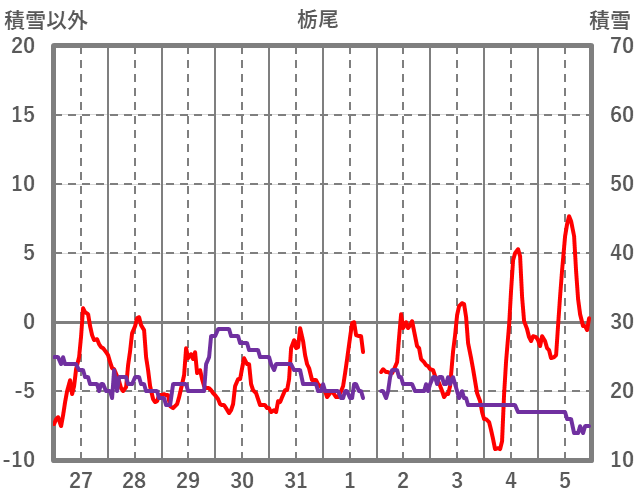 | 日 | 時 | 気温 | 降水 | 風向/風速 | 日照 | 積雪 | 降雪 |