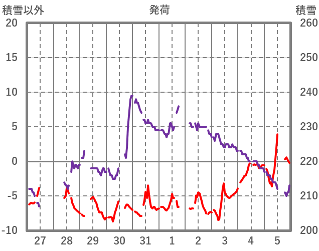 | 日 | 時 | 気温 | 降水 | 風向/風速 | 日照 | 積雪 | 降雪 |