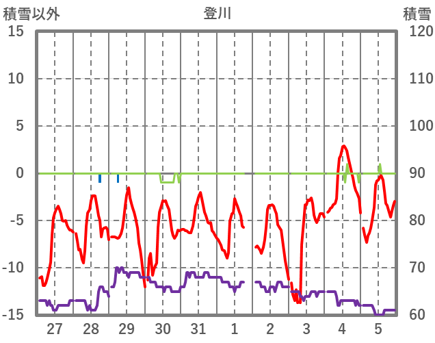| 日 | 時 | 気温 | 降水 | 風向/風速 | 日照 | 積雪 | 降雪 |