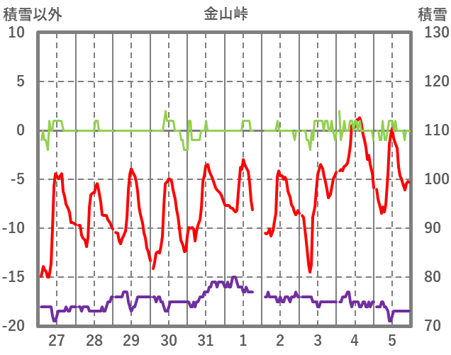 | 日 | 時 | 気温 | 降水 | 風向/風速 | 日照 | 積雪 | 降雪 |