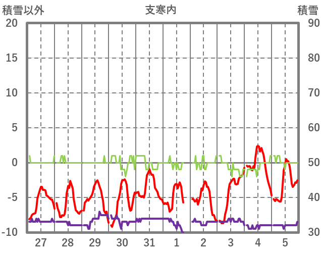 | 日 | 時 | 気温 | 降水 | 風向/風速 | 日照 | 積雪 | 降雪 |