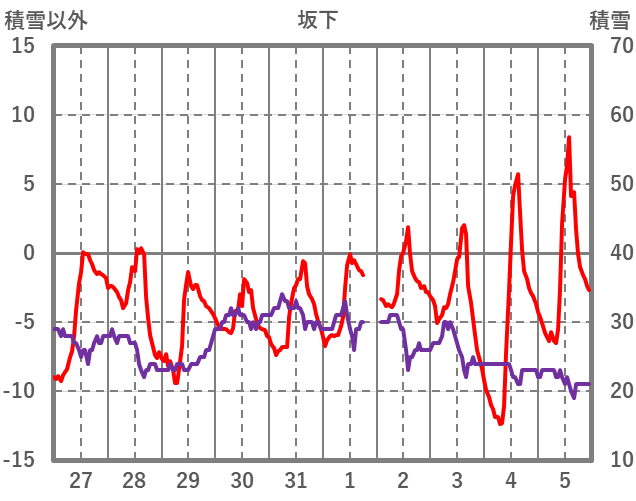 | 日 | 時 | 気温 | 降水 | 風向/風速 | 日照 | 積雪 | 降雪 |