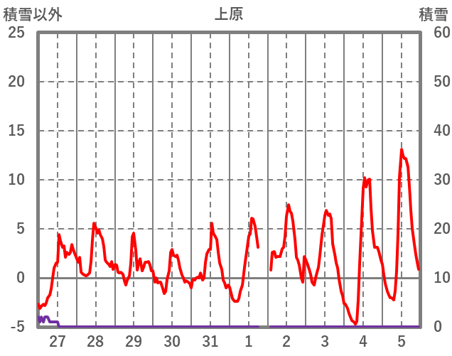 | 日 | 時 | 気温 | 降水 | 風向/風速 | 日照 | 積雪 | 降雪 |