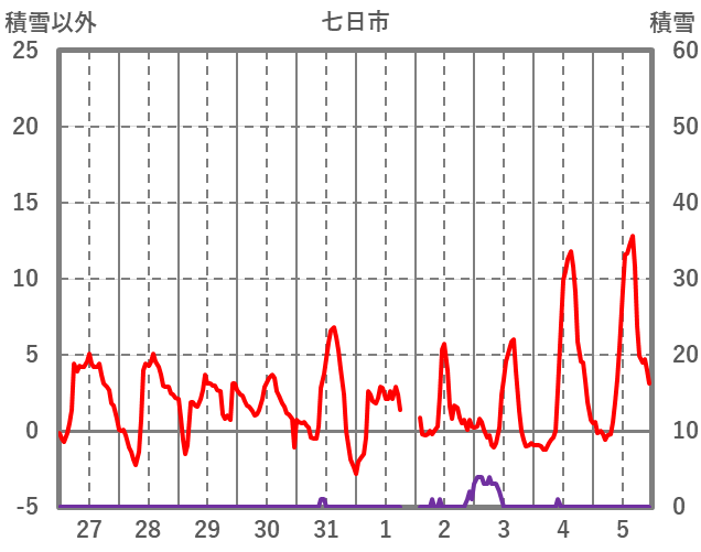 | 日 | 時 | 気温 | 降水 | 風向/風速 | 日照 | 積雪 | 降雪 |