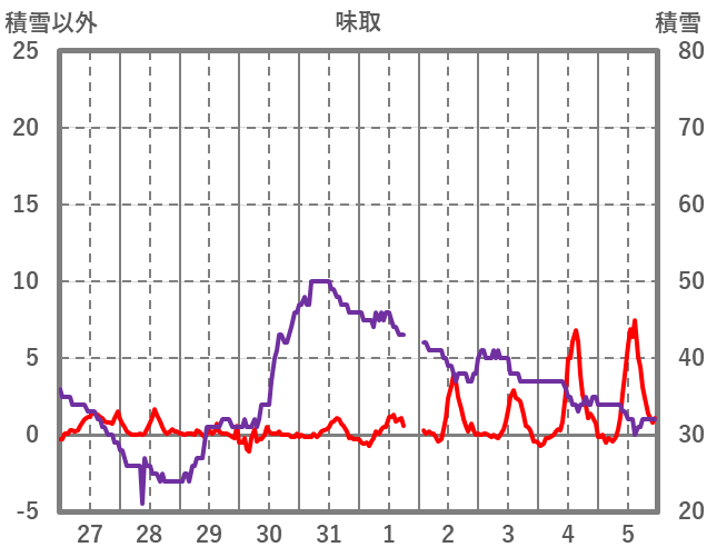 | 日 | 時 | 気温 | 降水 | 風向/風速 | 日照 | 積雪 | 降雪 |